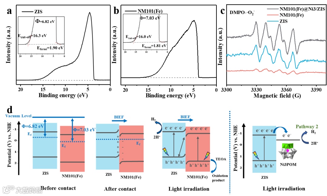 图5. (a) ZIS的UPS 图, (b) NM101(Fe)的UPS 图, (c) DMPO-·O2−的EPR 图 , (d) NM101(Fe)@Ni3/ZIS的双路径产氢机理