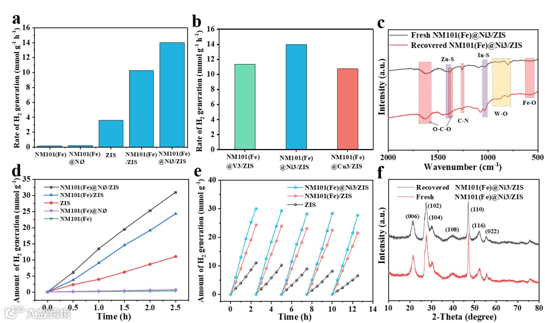 图2. 产氢活性柱状图(a) 不同催化剂 (b) NM101(Fe)@M3/ZIS (M=Ni, Cu, V). (c) 回收前后催化剂的FT-IR 图 (d) ZIS, NM101(Fe), NM101(Fe)/ZIS, NM101(Fe)@Ni3 and NM101(Fe)@Ni3/ZIS的光催化产氢动力学图 (e) ZIS, NM101(Fe)/ZIS, and NM101(Fe)@Ni3/ZIS的循环稳定性实验