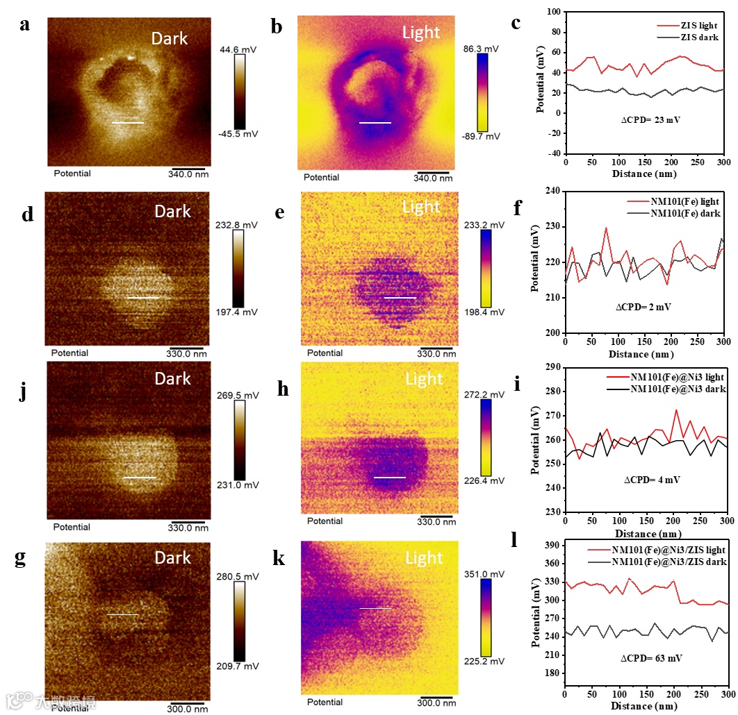 图4. 光照前后的 KPFM 电位图像, 包括(a-b) ZIS, (d-e) NM101(Fe), (j-h) NM101(Fe)@Ni3, 和 (g-k) NM101(Fe)@Ni3/ZIS; 光照前后的表面电位分布图,包括 (c) ZIS, (f) NM101(Fe), (i) NM101(Fe)@Ni3, 和 (l) NM101(Fe)@Ni3/ZIS.