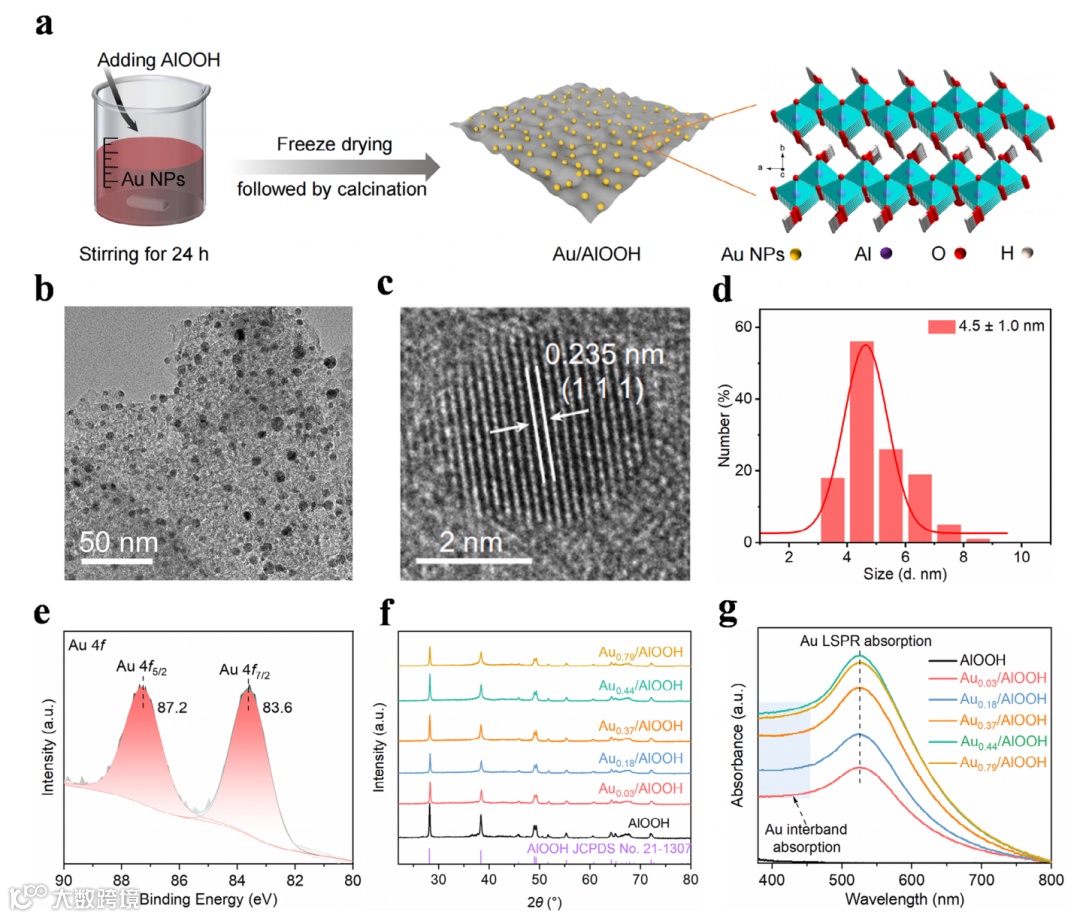 通过浸渍-煅烧法将Au NPs(平均粒径4.5 nm)负载于AlOOH表面,TEM与HRTEM证实Au NPs的存在;XPS进一步证实Au以金属态存在;XRD未检测到Au的特征峰,表明较低负载量的Au具有高度分散性。UV-Vis光谱显示Au/AlOOH在520 nm处呈现Au的等离子体共振吸收峰,在短波长处对应Au的带间吸收。