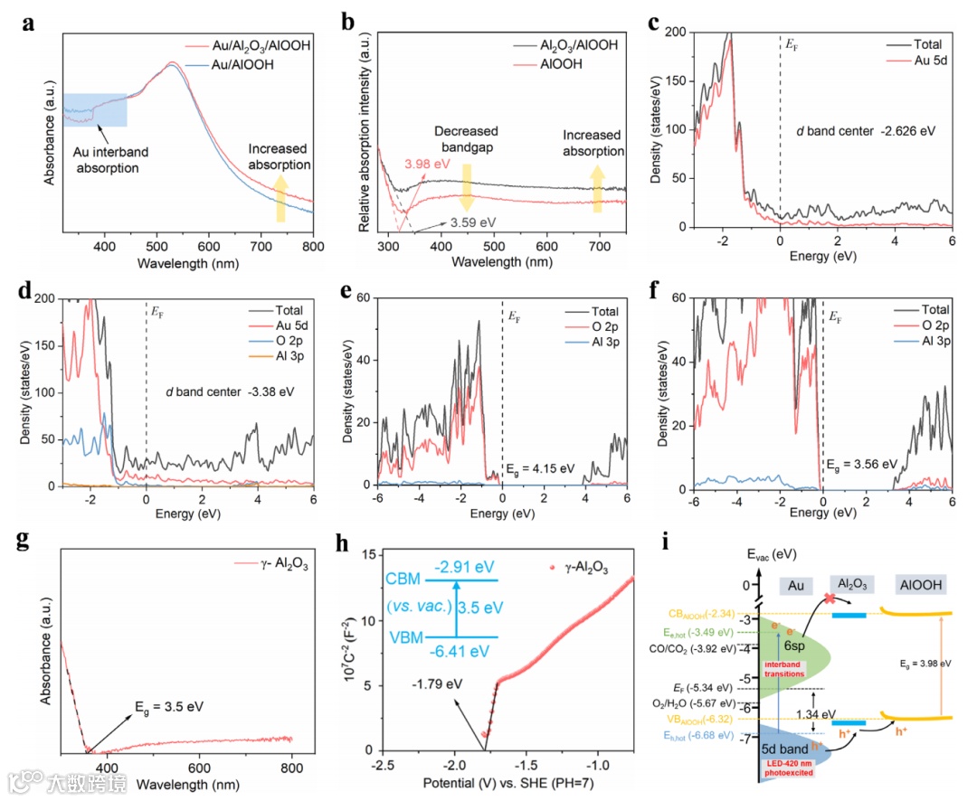 要点二:能带结构优化:γ-Al2O3纳米层的原位形成促使Au的5d带中心下移,增强了5d带空穴的氧化能力,同时缩小了AlOOH的带隙,提升光吸收效率。