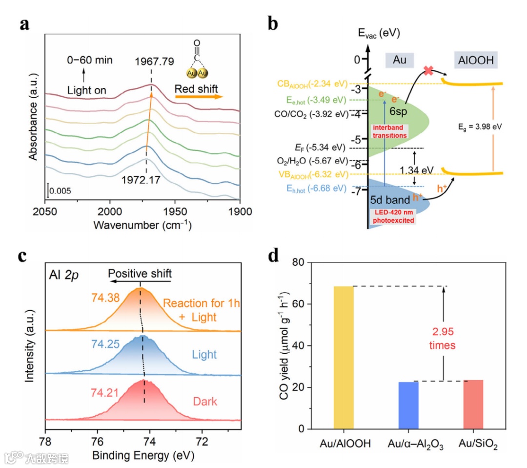 原位CO吸附FTIR显示光照下CO峰红移至1967.79 cm⁻¹,表明光生电子富集于Au表面并直接参与CO2还原。能带结构分析进一步验证界面处形成了较高的肖特基势垒有助于电子在Au表面的积累,并优先转移至反应物CO2而非AlOOH表面,Au 5d带空穴则可自发转移至AlOOH价带。原位光照XPS结果显示,原始Au/AlOOH光照后Al 2p XPS仅偏移0.04 eV,主要源于界面处的能带向上弯曲效应导致空穴易与Au表面的电子复合,限制了载流子的有效分离。此外,对比不同惰性载体(如SiO2和α-Al2O3)上Au NPs的光催化性能,发现Au0.18/AlOOH的CO产量显著高于Au/α-Al2O3和Au/SiO2,因此可以推测,宽带隙半导体AlOOH除了作为Au NPs的分散载体外,可能对光激发5d带空穴的分离表现出潜在的积极作用。