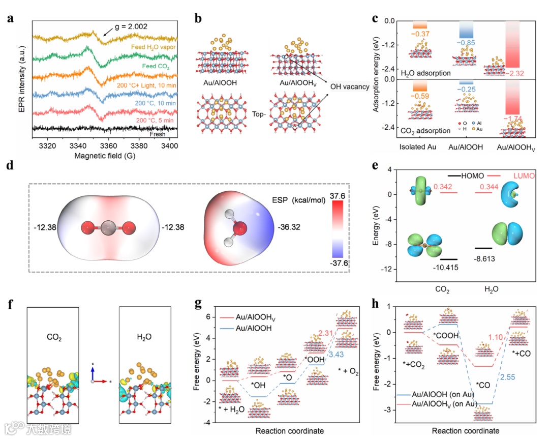 原位EPR光谱结果显示,在200°C及光照条件下,样品中出现g=2.002的羟基空位(OHV)峰,表明光催化过程中生成了OHV。进一步通过依次引入反应物分子CO2和H2O,发现引入H2O之后OHV的EPR强度减弱,说明OHV倾向于吸附H2O而并非CO2。通过吸附能、表面电荷密度和分子轨道能级等理论计算分析进一步显示OHV对H2O具有更强的吸附和活化能力。吉布斯自由能计算结果表明,引入OHV显著降低了H2O氧化和CO2还原的活化能,使反应路径更加有利。其中,*OOH的ΔG从3.43 eV降至2.31 eV,CO脱附的ΔG从2.55 eV降至1.10 eV,显示OHV有效促进了O2的生成和CO的脱附,证明OHV作为高效活性位点能够优先吸附和活化H2O,提供更多质子用于CO2还原,显著提升了光催化剂的整体CO2还原效率。