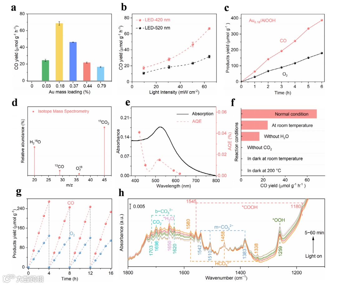 Au0.18/AlOOH在单波长LED-420 nm光照下CO产率最高(68.58 µmol·g⁻¹·h⁻¹),且CO与O2产率接近2:1。光强依赖性实验表明CO2还原为光生电子主导过程,同位素实验(13CO2和H218O)证实产物来源于CO2还原与H2O氧化,原位FTIR揭示了光催化CO2还原耦合H2O氧化的反应路径为CO2→*CO2→*COOH→*CO→CO(g)及H2O→*H2O→*OH→*OOH→*O2→O2(g).