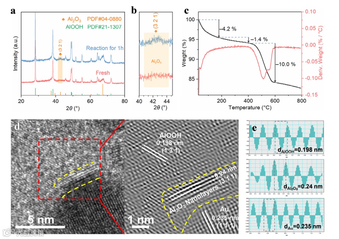 为了验证上述推测,对反应过程中光催化剂结构的动态演变进行了探究,PXRD分析显示,反应后的样品在42.8°位置出现新的微弱衍射峰,对应于γ-Al2O3的(321)晶面,表明AlOOH载体在光催化反应条件下部分转化为γ-Al2O3纳米层。HRTEM图像进一步证实了这种纳米层的形成,即在界面处显示出约2 nm厚的γ-Al2O3层。为了揭示γ-Al2O3纳米层的形成机理,对Au0.18/AlOOH进行了热重分析,发现界面处的γ-Al2O3纳米层是由于外界反应温度(200°C)和Au NPs受光照的光热协同加热效应所致,该过程涉及AlOOH受热后导致一小部分结构Al3+-OH以H2O的形式去除。