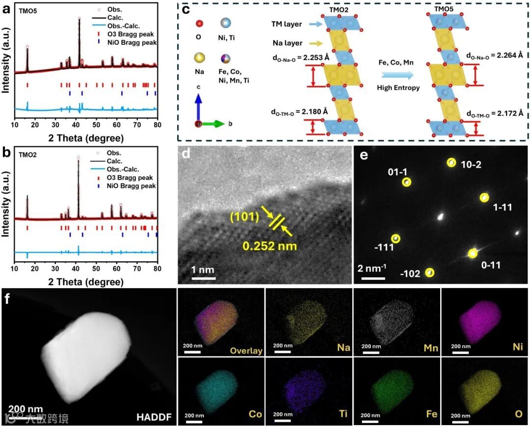 图2. TMO5和TMO2的Rietveld精修XRD图:(a) TMO5;(b) TMO2;(c) TMO5与TMO2晶体结构示意图;(d) TMO5的HRTEM图像;(e) TMO5的SAED图;(f) TMO5的元素分布图。