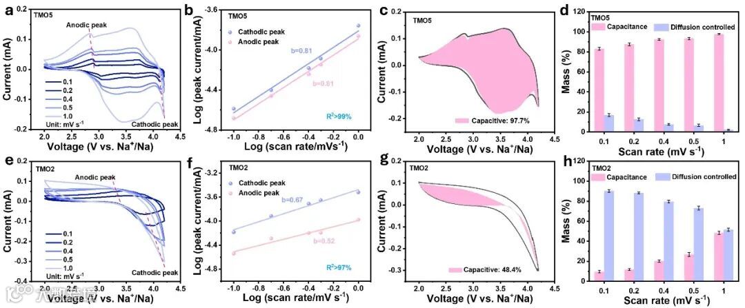 图5. (a, e) 不同扫描速率下的CV曲线;(b, f) 峰值电流与扫描速率的对数图;(c, g) 扫描速率为1 mV s⁻¹时的赝电容贡献详细区域;(d, h) TMO5与TMO2在不同扫描速率下的赝电容和扩散贡献率。