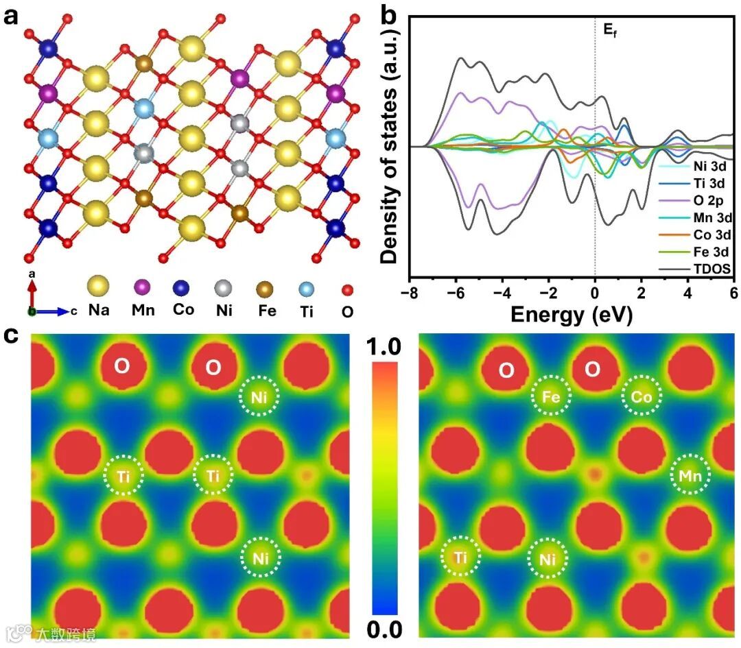 图7借助理论计算深入解析了高熵材料TMO5的晶体结构与电子性质。图7(a)呈现了TMO5的优化晶体结构模型,直观体现出高熵构型对结构稳定性的贡献;图7(b)的能态密度(DOS)计算结果表明,高熵设计能够有效调控电子结构,提升电子导电性,从而提高电化学性能;图7(c)则对比了TMO2与TMO5的二维电荷密度分布,明确指出TMO5具有更均匀的电荷分布与更强的金属-氧键相互作用,这有利于增强晶格结构稳定性和电荷传输能力。这些分析为高熵设计在钠离子电池正极材料性能提升中的作用提供了强有力的理论支撑