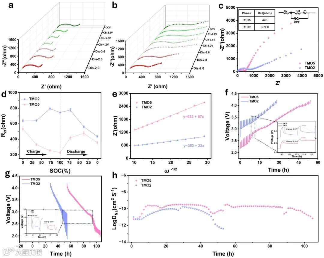图4. TMO5与TMO2钠离子传输动力学的表征:在2.0–4.2 V首次循环期间,(a) TMO5与(b) TMO2的原位EIS充放电图;(c) 10次循环后的EIS图(图中插图为等效电路模型及两样品的Rct拟合值);(d) 通过Nyquist图拟合得到的不同荷电状态下TMO5与TMO2正极的电荷转移电阻Rct;(e) TMO5与TMO2的Warburg系数w与阻抗Z’的关系;(f) TMO5与(g) TMO2的GITT充电与放电曲线,以及(h)相应的离子扩散系数。