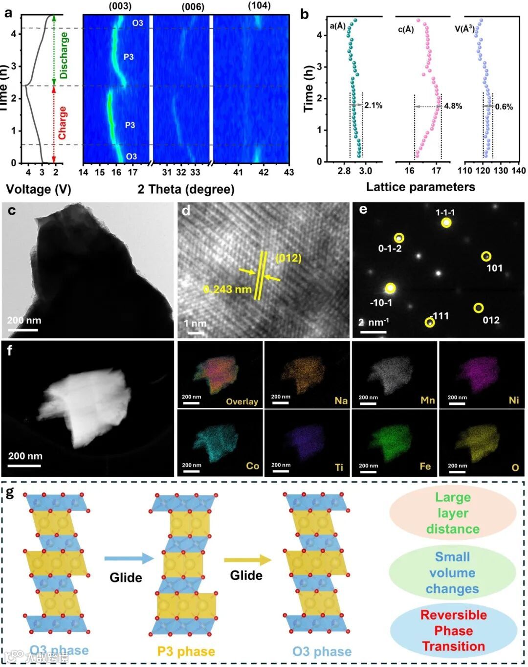 图6. (a) TMO5的原位XRD图;(b) 相关晶格参数图;(c, d) TMO5的TEM与HRTEM图像;(e) TMO5的SAED图;(f) TMO5在200次循环后获得的HAADF图及对应的元素分布图;(g) 充放电过程中的相变示意图。