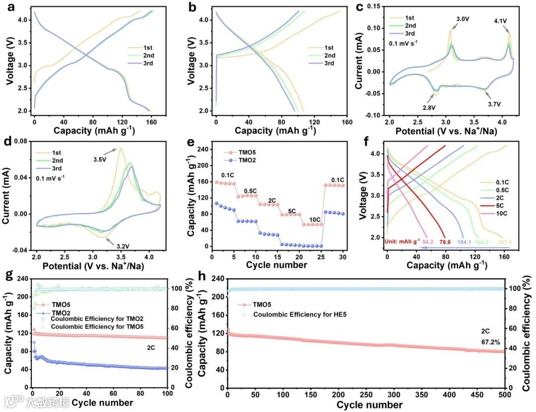 图3. TMO5与TMO2的电化学性能:在0.1 C下,(a) TMO5和(b) TMO2前3个循环的充放电曲线;(c) TMO5和(d) TMO2的CV曲线;(e) TMO5与TMO2的倍率性能;(f) TMO5在0.1 C至10 C下的充放电曲线;(g) TMO5与TMO2在2 C下的循环性能;(h) TMO5在2 C下的长期循环性能。
