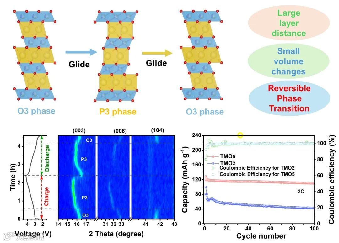 基于此,中国计量大学康巧玲博士与九州工业大学马廷丽教授引入了一种高熵方法,并结合协同多金属效应,通过同时增强结构稳定性和反应动力学来解决这些局限性。该研究发表在Journal of Colloid and Interface Science期刊,题为“High-entropy engineering enables O3-type layered oxide with high structural stability and reaction kinetic for sodium storage”,九州工业大学王雄为论文第一作者,康巧玲、马廷丽为论文共同通讯作者。采用简单的固相法大规模制备了一种新型的O3型层状高熵正极材料Na0.9Fe0.258Co0.129Ni0.258Mn0.258Ti0.097O2(TMO5)。实验分析结合原位/非原位表征验证了高熵金属离子混合不仅改善了氧化还原反应的可逆性和O3-P3-O3相变行为,还增强了Na+扩散性。得益于其优异的结构和组分,TMO5展现出较高的初始比容量(159.6 mAh g⁻¹)和在2 C倍率下经过100次循环后依然保持85.6%的容量(110.1 mAh g⁻¹)。本研究展示了高熵O3型层状氧化物在实现稳定、高性能钠离子电池正极方面的巨大潜力。赋予高熵氧化物优异电化学性能,为高性能高熵氧化物正极开发提供重要指导。