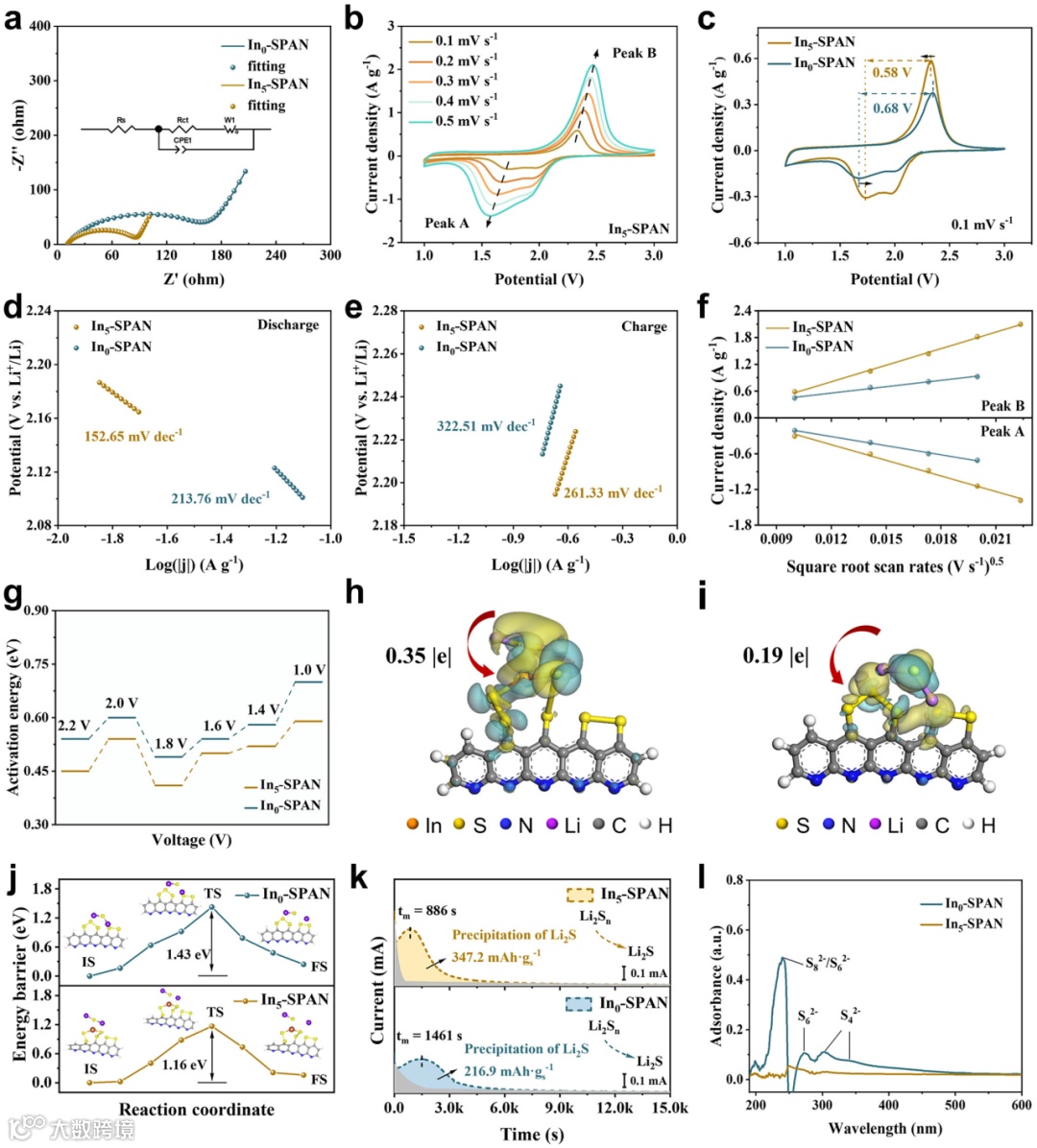 EIS结果显示,In5-SPAN的电荷转移电阻明显低于In0-SPAN(74 Ω vs. 161 Ω),界面电子传输更快;CV测试表明其在多个扫描速率下展现更高的峰电流和更小的电位极化,表明其硫的氧化还原反应动力学明显提升。Tafel曲线显示其充放电斜率均显著降低,反应速率更快。锂离子扩散系数在氧化/还原过程中分别提升约4.6倍和2.1倍,说明无定形In–S结构降低了扩散阻力。温度依赖的EIS测量揭示In5-SPAN在放电各阶段具有更低的激活能,进一步验证其动力学优势。DFT模拟和Bader电荷分析表明,In原子引入有助于稳定硫原子并增强电子耦合,增强Li2S吸附能力,并显著降低其解离能垒(1.16 eV vs. 1.43 eV)。Li2S的成核和溶解测试显示,In5-SPAN样品沉积更早、电流响应更强、沉积容量更高,且其起始电位更低(−0.46 V vs. -0.42 V)。以上结果表明,非晶In–S配位结构通过增强电子耦合、降低能垒和促进Li2S界面反应等,显著提升了SPAN阴极的硫转化动力学。