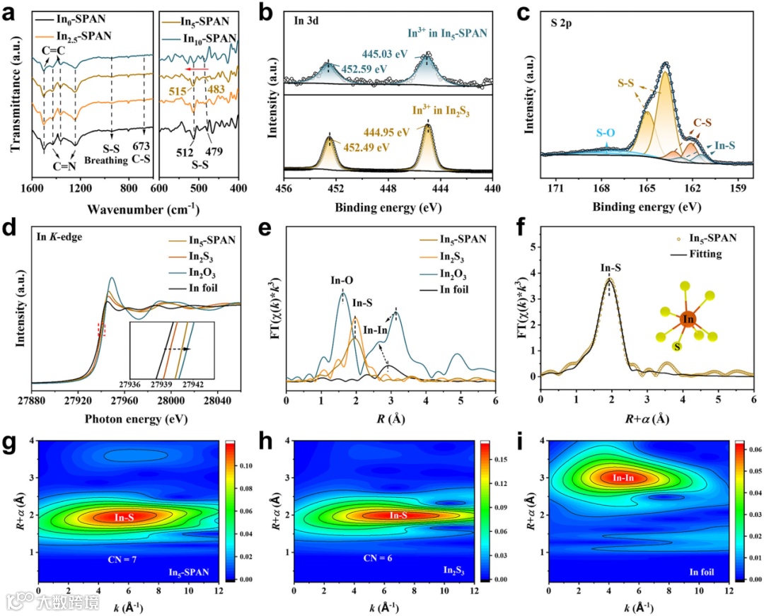 FTIR和Raman光谱表明In掺杂未破坏SPAN主体结构。XPS分析进一步证明了In–S键的形成,且In的结合能略高于结晶态In2S3,说明其处于更高价态。X 射线吸收精细结构(XAFS)分析揭示In在SPAN中处于无定形硫配位环境:XANES 显示其吸收边明显高于金属In和In2S3;FT-EXAFS分析表明In–S键长约1.95 Å,介于In2S3(1.98 Å)与 In2O3(1.62 Å)之间。小波变换(WT)-EXAFS与拟合结果表明非晶态In的平均配位数为7,明显高于晶态In2S3(配位数为6),体现了非晶结构更高的配位能力。