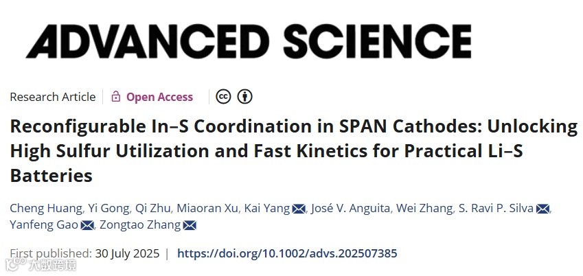 近日,郑州大学的张宗涛教授与英国萨里大学拉维·席尔瓦院士、杨凯研究员、上海大学高彦峰教授团队合作,在国际知名期刊Advanced Science上发表题为“Reconfigurable In‒S Coordination in SPAN Cathodes: Unlocking High Sulfur Utilization and Fast Kinetics for Practical Li‒S Batteries”的文章。该研究在SPAN基体中原位引入非晶态铟–硫(In–S)复合结构,构建了可在充放电过程中动态断裂与重构的可逆In–S配位结构,不仅增强了中间多硫化物的锚定能力,还加速了硫的转化动力学。在仅添加1.18 wt.%铟条件下,SPAN电极的活性物质占比显著提升至47.4 wt.%,较传统策略提升约23%。优化后的电极展现出优异的循环稳定性与倍率性能,即使在高负载(8.7 mg·cm-2)和贫电解液(E/SPAN=4.1 μL·mg-1)严苛条件下,仍能实现高达1048 mAh·g-1的比容量。该成果为锂硫电池高能量密度与长寿命的协同优化提供了新思路,并为其实际应用提供了新材料基础和理论支持。