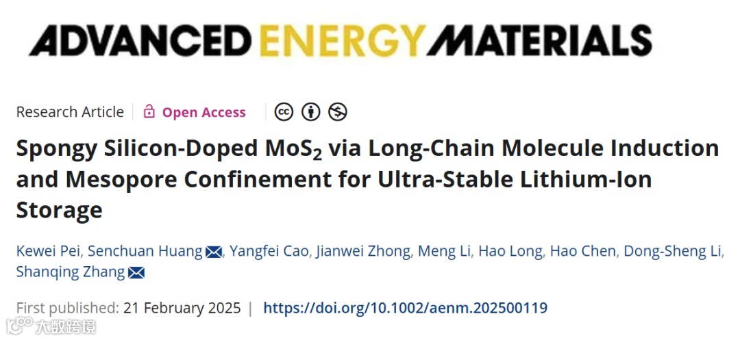 Kewei Pei, Senchuan Huang,* Yangfei Cao, Jianwei Zhong, Meng Li, Hao Long, Hao Chen, Dong‐Sheng Li, Shanqing Zhang*. Spongy Silicon‐Doped MoS2via Long‐Chain Molecule Induction and Mesopore Confinement for Ultra‐Stable Lithium‐Ion Storage. Advanced Energy Materials, 2025,