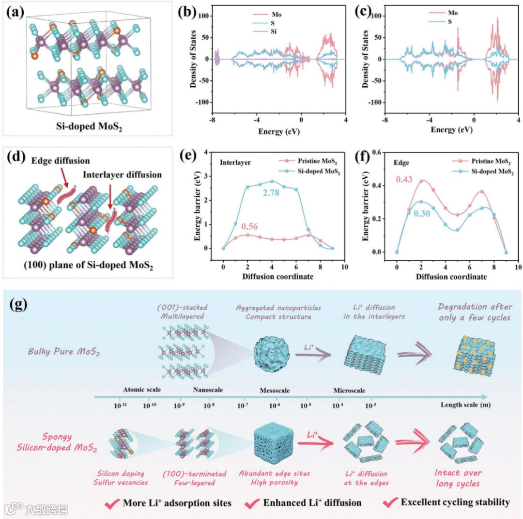 DFT计算表明,硅掺杂显著改变MoS2的电子结构,增强了其电子导电性。在该材料中,Li+在边缘位点扩散比层间更有利,比原始MoS2具有更低的扩散能垒。