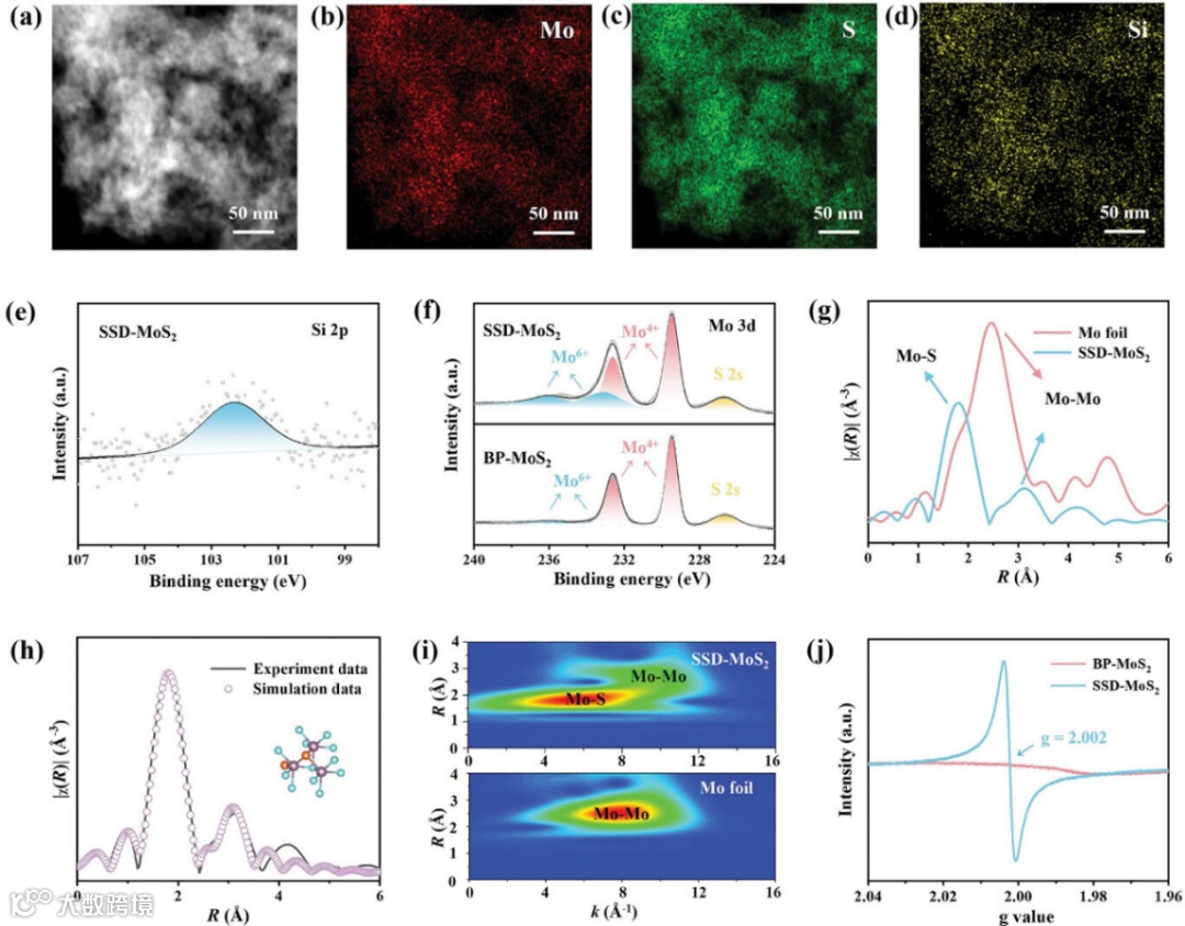 该材料呈现海绵状纳米碎片结构,具有丰富的介孔和大孔,可归因于长链分子的诱导作用及mSiO2框架刻蚀过程的剪切应力。TEM、XRD、Raman证实了该材料中MoS2具有少层结构特性。元素Mapping、XPS、EXAFS证实了硅元素成功掺入MoS2晶格中,并造成了硫空位。