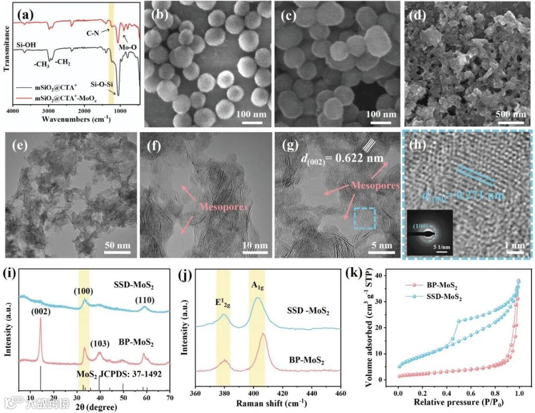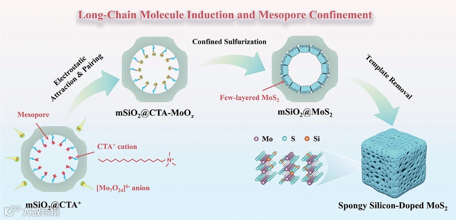 合成介孔SiO2过程中使用的软模板长链分子(如CTAB)均匀分布在介孔内。由于其带正电荷的特性,长链分子通过静电作用与钼酸阴离子([Mo7O24]6-)精确配对,从而诱导钼复合物纳米粒子在介孔中均匀沉积。随后,通过高温限域硫化,MoS2在介孔内原位生长。在此过程中,mSiO2模板中的硅原子部分扩散到MoS2晶格中,实现了硅掺杂。去除mSiO2模板后,即得到独特的海绵状硅掺杂MoS2材料。