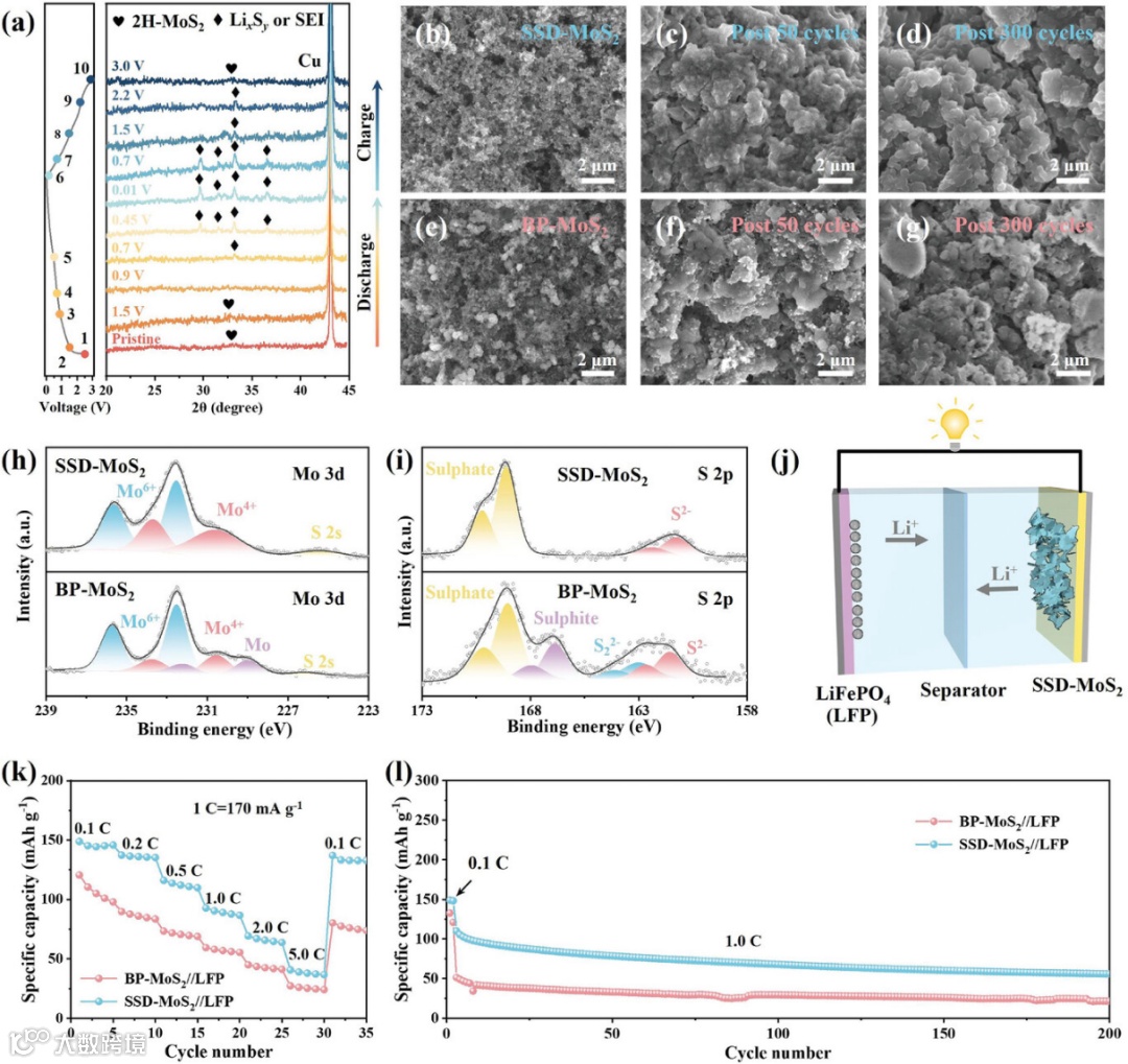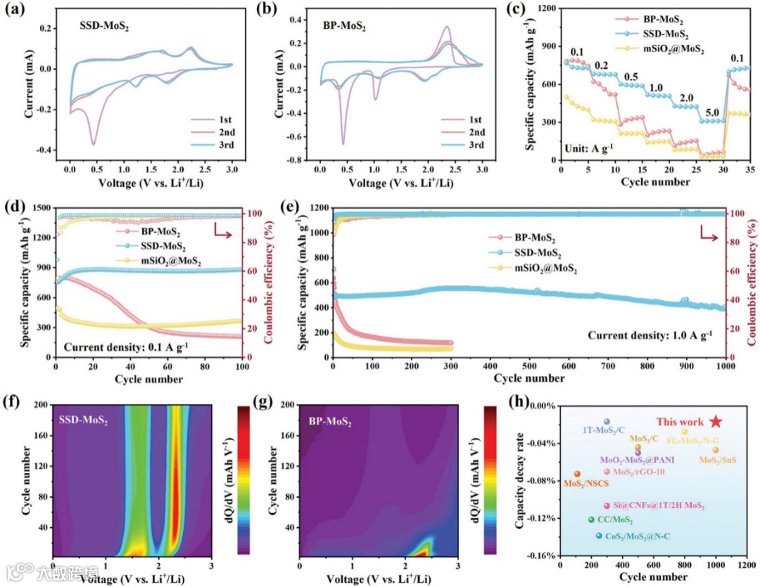 图7:SSD-MoS2负极的锂离子存储机制:(a) 用于密度泛函理论计算的硅掺杂MoS2结构模型;(b, c) 硅掺杂MoS2和原始MoS2的投影态密度图;(d) 硅掺杂MoS2(100)晶面上锂离子扩散路径的示意图;(e, f) 硅掺杂MoS2层间和边缘的锂离子扩散能垒计算结果,并与原始MoS2结构进行比较;(g) BP-MoS₂和SSD-MoS2负极锂离子存储机制的对比示意图。