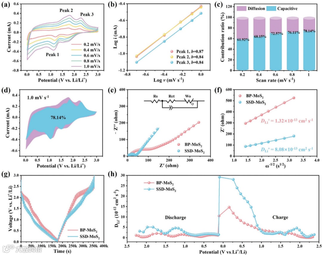 在半电池测试中,该材料在0.1 A g-1时实现了高达767.9 mAh g-1的可逆容量,并展现出优异的循环稳定性,即使在1.0 A g-1下经过1000次循环后容量保持仍超过83%,性能显著优于大多数已报道的MoS2基负极材料。在全电池测试中,该材料也表现出卓越的倍率性能和循环稳定性。该材料储存锂离子主要由赝电容行为主导,同时导电性和锂离子扩散能力得到了显著增强。