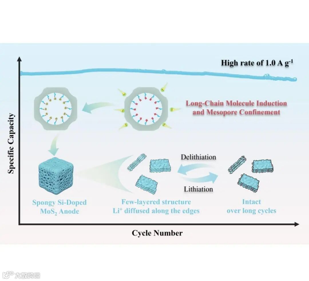 提出了一种基于介孔框架内长链分子诱导合成的新策略,成功构建了海绵状硅掺杂MoS2负极材料。该材料由具有高孔隙率的少层纳米碎片组成,富含边缘位点和硫空位,实现了跨越八个数量级长度尺度的纳米结构调控。这种独特的结构不仅促进了锂离子的高效传输,还使得沿边缘的可逆Li⁺扩散更加有利,与传统MoS2负极的层间Li⁺存储机制截然不同,同时有效缓解了充放电循环过程中电极的体积变化。因此,该材料在半电池和全电池中均表现出高可逆容量和优异的倍率性能,尤其是在高电流密度1.0 A g-1下循环1000次后容量保持率高达83%,显著优于近期报道的大多数MoS2基负极材料。这项工作为设计高性能层状过渡金属二硫化物负极材料开辟了新途径。