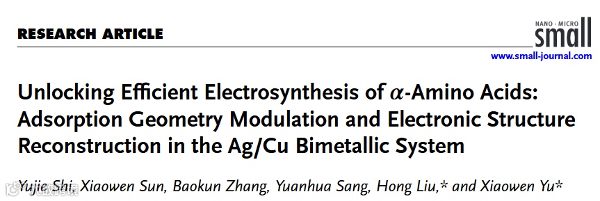基于此,山东大学于小雯教授、刘宏教授团队在国际知名期刊Small上发表题为“Unlocking Efficient Electrosynthesis of α-Amino Acids: Adsorption Geometry Modulation and Electronic Structure Reconstruction in the Ag/Cu Bimetallic System”的研究论文。该研究通过实验和理论计算相结合的方法,以丙酮酸为模型碳源,研究了Ag/Cu纳米线(NWs)在α-酮酸与NH2OH还原胺化电合成α-氨基酸中的应用。该观点文章不仅实现了高产率、高活性地合成多种α-氨基酸,同时揭示了Ag位点的加入可以有效调节反应中间产物的吸附构型,并重构催化剂的电子结构,从而有效地增强中间产物的吸附和活化。该工作综合考虑了中间产物的吸附构型、催化剂的电子结构以及竞争性副反应,为氨基酸的绿色高效电合成提供了一种有效的方法。