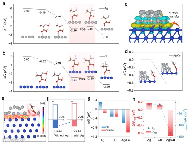 图1 .(a)Ag(111)和(b)Cu(111)催化剂电合成丙氨酸的Gibbs自由能曲线。(c)Ag(111)/Cu(111)催化剂的Bader电荷转移和电荷密度差。(d)Ag(111)/Cu(111)催化剂在COOHCH3CNH-COOHCH3CNH2步骤中的Gibbs自由能曲线。(e)*COOHCH3CNH中间体在Ag(111)/Cu(111)的独立梯度模型图。(f)无Ag或有Ag时Cu的d带中心示意图。(g)*H、*CHOHCHNOH(肟)在Ag(111)、Cu(111)、Ag(111)/Cu(111)表面的吸附能比较。(h)丙氨酸在Ag、Cu和Ag/Cu催化剂上的ΔGPDS和JAla。
