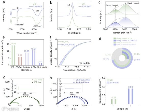 红外、核磁和拉曼光谱表明,微量PSVE不影响水的氢键结构。尽管如此,基于界面调控的有效性, 离子电导率和Zn2+迁移数(0.90)提升并进一步优化了电极界面传导行为。