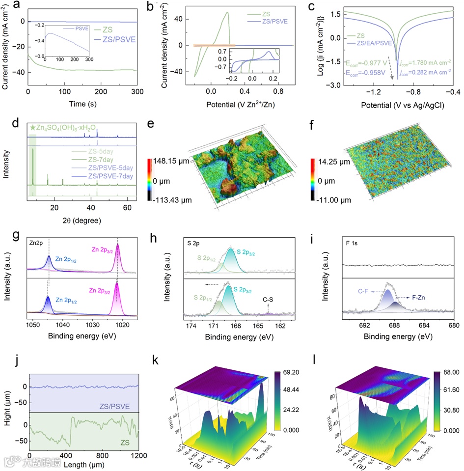 图3:Cu//Zn电池的CA曲线。b) Cu//Zn的循环伏安曲线。c) Zn在不同电解液中的Tafel极化曲线。d) Zn片浸泡后的XRD图谱。e–f) 循环后Zn表面显微形貌。g–i) Zn负极XPS谱图j) Zn负极的表面高度轮廓图。k–l) Zn//Zn电池的DRT分析。