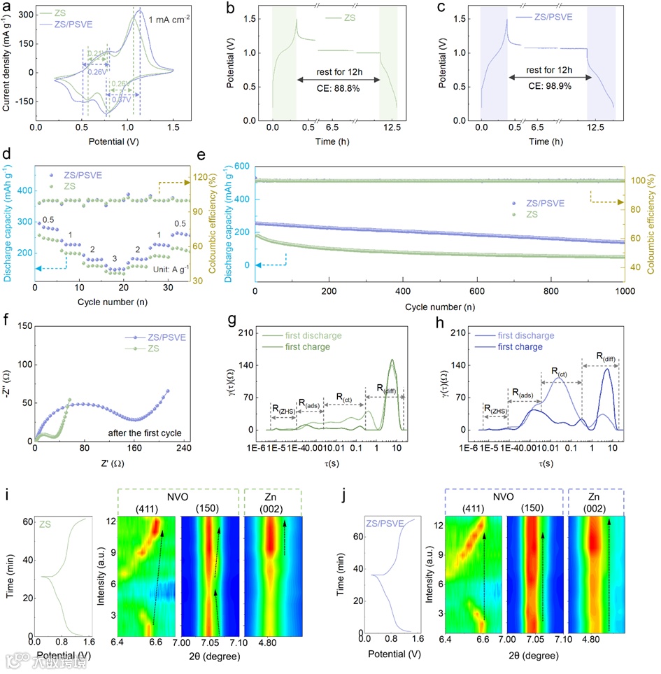 NVO//Zn全电池在加入PSVE后表现出显著性能提升。原位XRD与EIS-DRT等表征显示,PSVE增强了Zn负极与NVO正极的结构稳定性与锌离子迁移动力学,显著提升了全电池的可逆性与实用性。