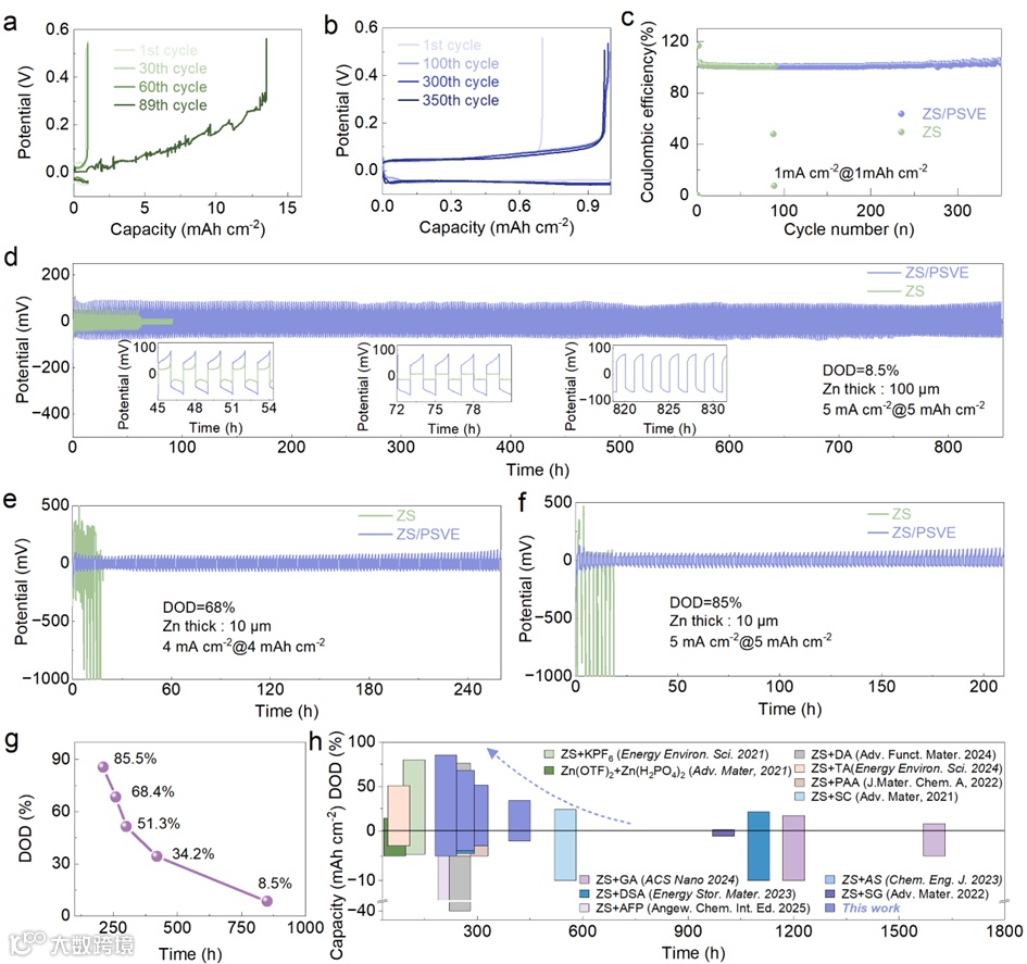 PSVE显著提升了Zn//Zn电池在不同深度放电(DOD)下的循环寿命,尤其在85.5% DOD条件下仍能稳定运行超过200小时。
