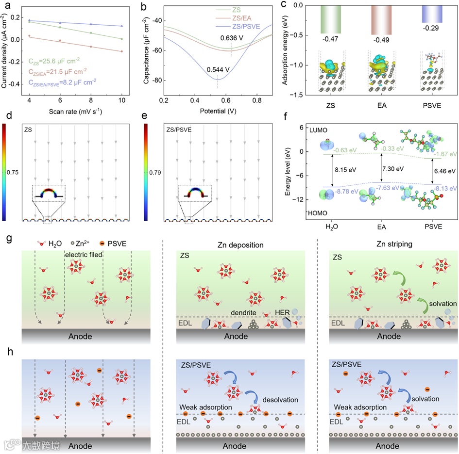本图通过电化学测试、DFT计算与COMSOL模拟展示了PSVE在Zn负极表面的弱吸附分子阻尼行为如何重构电场分布。相比传统电解液,PSVE可有效缓解“尖端效应”,促使Zn²⁺均匀沉积。同时,较窄的HOMO-LUMO能隙有助于提升界面电导率与稳定性。
