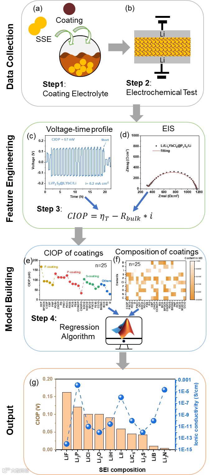 图3. SEI组分与CIOP的关联模型 (a-b) 25种涂层材料筛选与Li//Li电池组装;(c-d) 恒流循环与EIS数据提取CIOP;(e-f) 涂层组分与CIOP关系建模;(g) 关键SEI组分的CIOP与离子导对比。