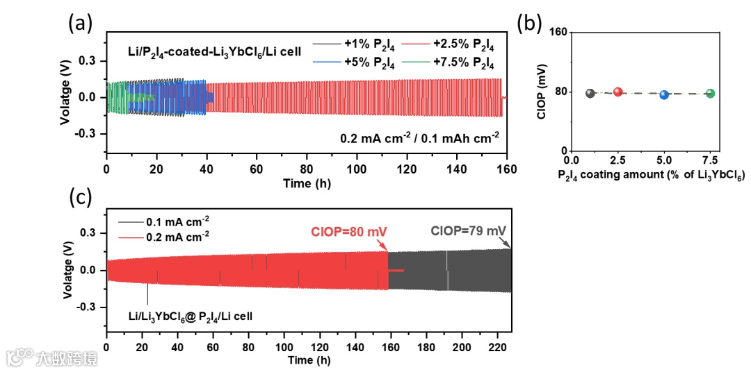 图7. P2I4涂层量对Li/卤化物电解质/Li电池循环性能的影响。