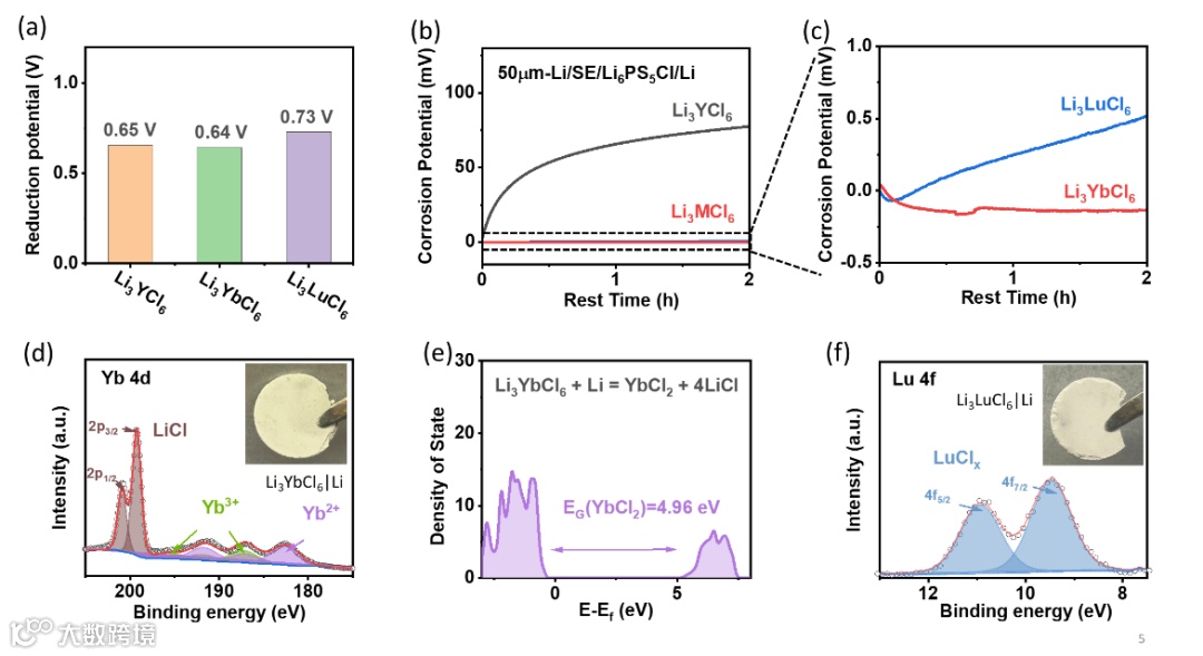 图2. 卤化物电解质的锂金属稳定性 (a) 卤化物电解质还原电位;(b-c) Li对电解质的腐蚀电位动态监测,Li3YbCl6/Li3LuCl6腐蚀电位趋近0 V;(d) Li接触后Li3YbCl6表面YbCl2的XPS表征;(e) YbCl2的电子态密度(禁带宽度4.96 eV);(f) Li3LuCl6表面LuClx的XPS分析。