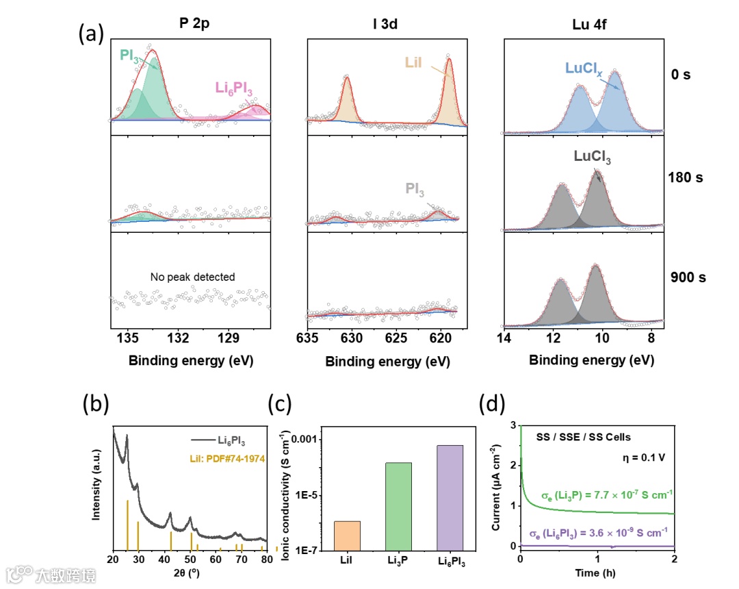 图4. PI3衍生界面的特性 (a) 循环后PI3涂层表面XPS显示Li6PI3生成;(b) Li6PI3晶体结构(类Li4I4框架);(c) Li6PI3离子导达6.2×10-4 S cm-1(优于LiI/Li3P);(d) 超低电子导(3.6×10-9 S cm-1)抑制副反应。