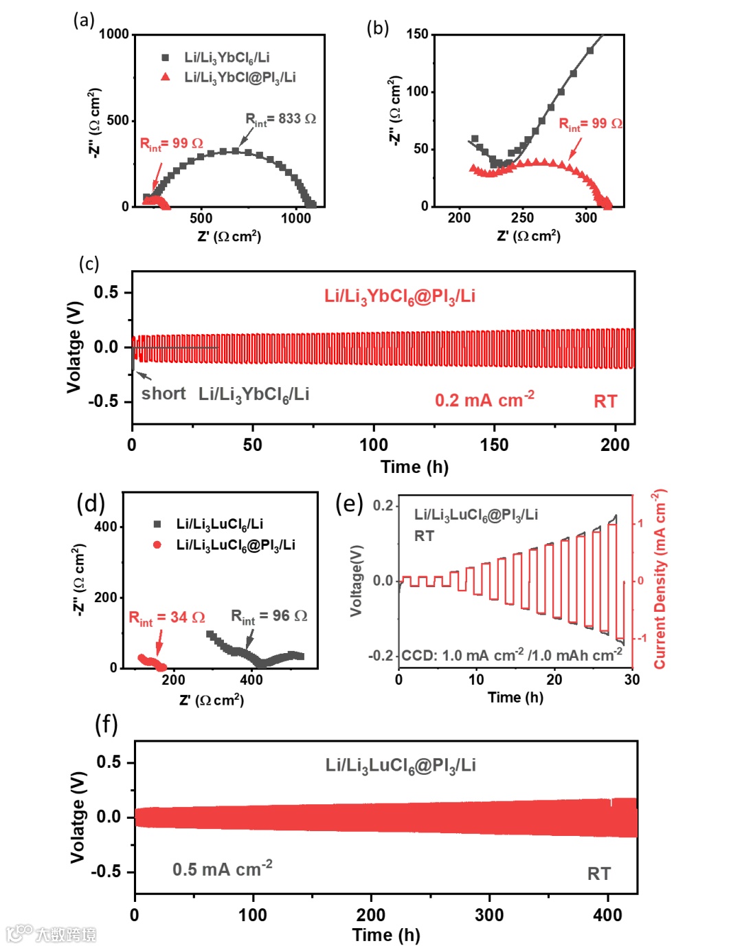 图5. 涂层电解质抑制锂枝晶性能 (a-b) PI3涂层使Li3YbCl6界面电阻从833 Ω降至99 Ω;(c) Li//Li对称电池稳定循环200小时(0.2 mA cm⁻²);(d-e) Li3LuCl6@PI3实现CCD=1.0 mA cm-2;(f) 0.5 mA cm-2下400小时无短路。