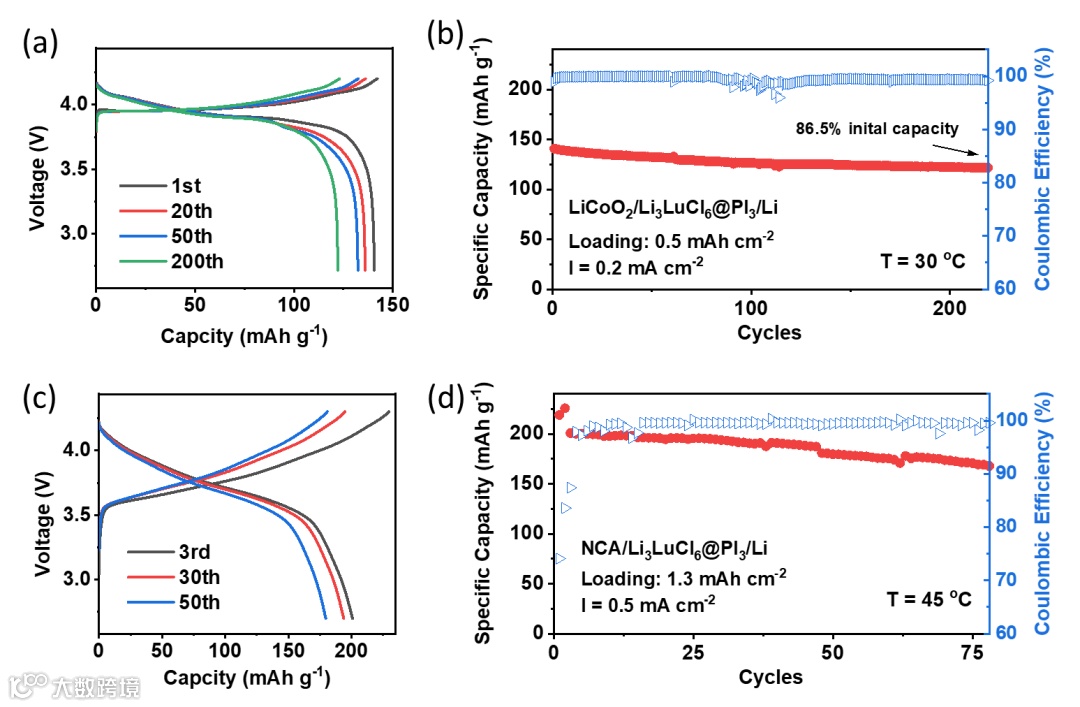 图6. 全电池性能验证 (a-b) LiCoO2//Li3LuCl6@PI3//Li电池(30 oC):首圈容量140.6 mAh g-1,220周容量保持86.5%;(c-d) NCA正极(45 oC):1.3 mAh cm-2负载下循环75周容量保持84.7%。