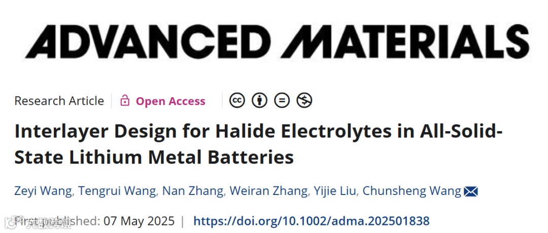 近日,马里兰大学王春生教授团队在Advanced Materials期刊发表题为“Interlayer Design for Halide Electrolytes in All-Solid-State Lithium Metal Batteries”的研究论文。团队通过设计新型卤化物电解质Li3YbCl6/Li3LuCl6与磷碘复合中间层(PI3),成功解决卤化物电解质与锂金属的界面兼容性难题,实现了高临界电流密度(1.0 mA cm⁻²)和长循环稳定性(400次循环容量保持86.5%),为高能量密度全固态电池开辟新路径。