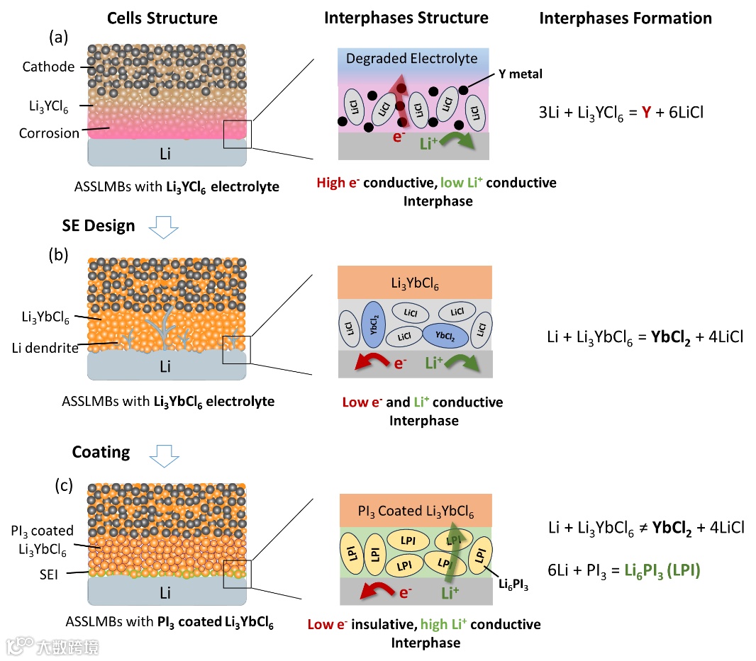 图1. 卤化物电解质抑制锂枝晶策略 (a) Li₃YCl₆电解质:锂负极界面生成高电子导、低离子导的Y金属/LiCl混合层,引发持续降解;(b) Li₃YbCl₆电解质:生成低电子导的YbCl₂/LiCl界面,但仍因低离子导引发锂枝晶;(c) PI3涂层Li₃YbCl₆:PI3还原为高离子导Li₆PI₃,构建电子绝缘界面,阻断枝晶生长。