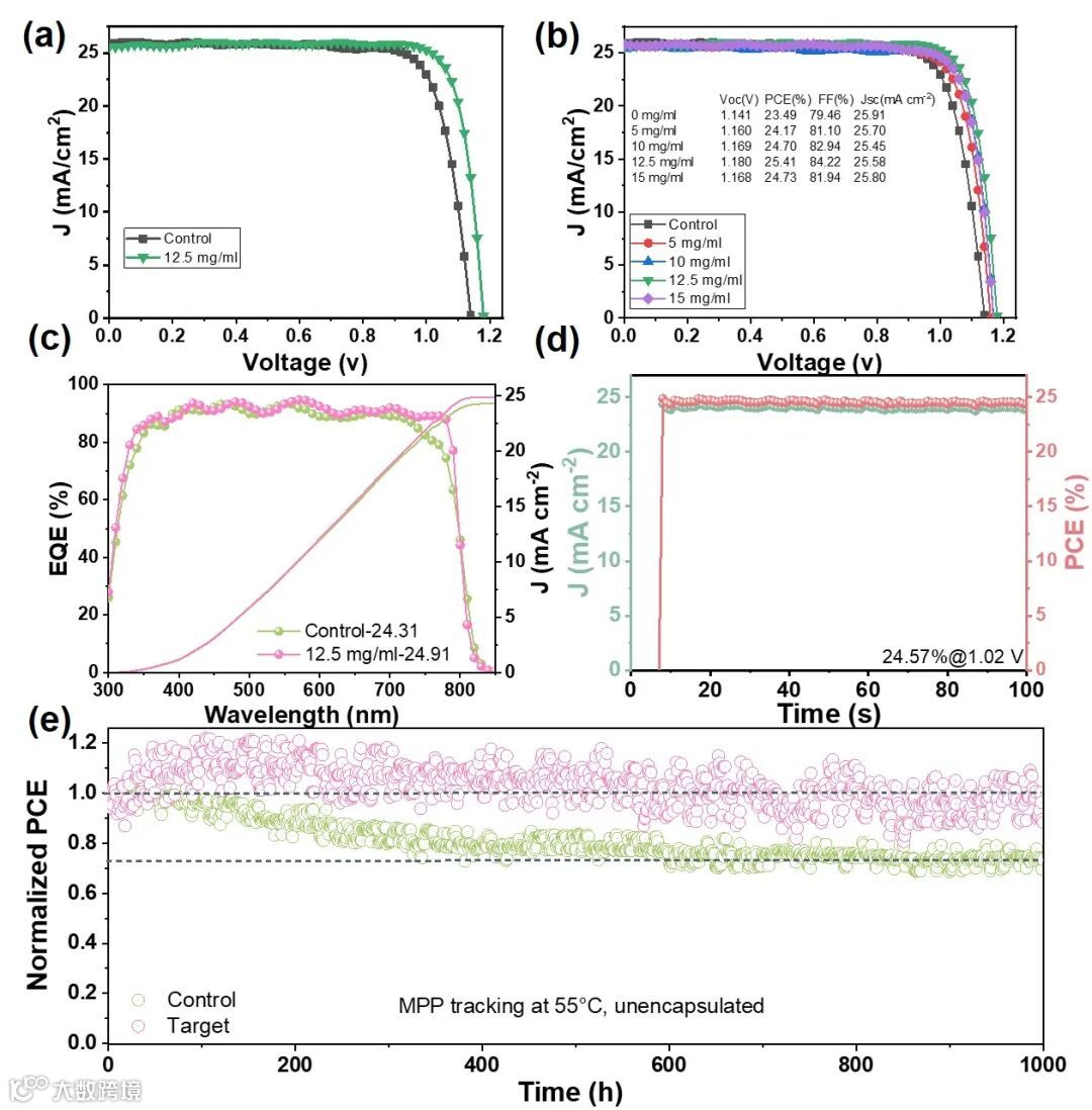 基于 12.5mg/mL S-2 构建的二维/三维钙钛矿太阳能电池(PSCs),功率转换效率(PCE)达 25.41%,显著高于对照组(23.49%);开路电压(Vₒc)从1.147V 提升至1.183V,填充因子(FF)从79.46% 增至84.22%,EQE 积分电流密度从24.31mA・cm⁻² 提升至24.91mA・cm⁻²,在最大功率点(MPP)下稳定输出 PCE 为24.57%,100s内无明显波动。未封装器件在环境条件(室温、30%相对湿度)下存放1000h,对照组 PCE 仅保留初始值的65.8%,而二维/三维器件保留91.1%;在55℃、氮气氛围下进行1000h MPP跟踪,二维/三维器件仍能保持初始效率的85%,对照组仅保留 75%。