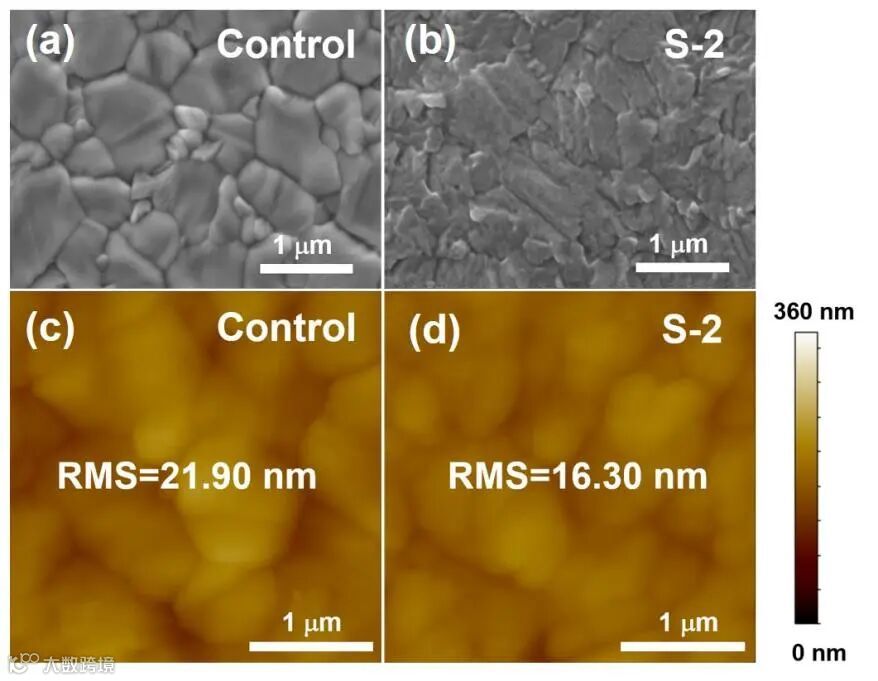 图 3.(a-b)对照组钙钛矿薄膜以及经 S-2 处理后的钙钛矿薄膜的顶部扫描电子显微镜(SEM)图像和(c-d)原子力显微镜(AFM)图像。