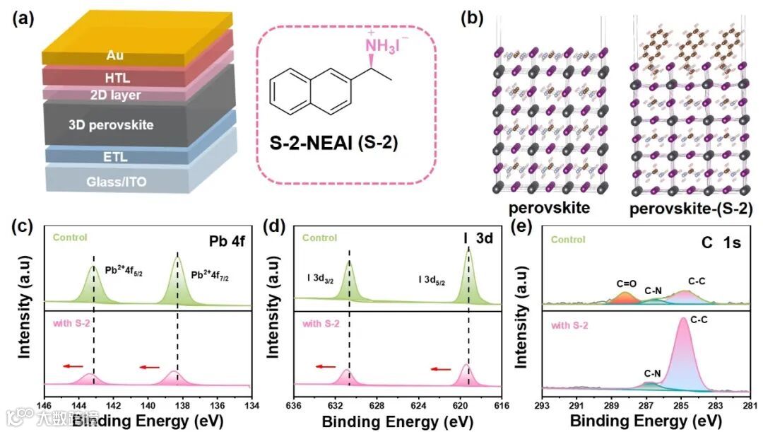 图 1. a) 本研究中所探讨的器件结构示意图,以及 S-2-NEAI(简称为 S-2)的分子结构;b) FAPbI₃及其上含有 S-2 的 FAPbI₃;c-e) 对照组钙钛矿以及沉积了 S-2 的钙钛矿的 Pb 4f、I 3d 和 C 1s 的 XPS 光谱