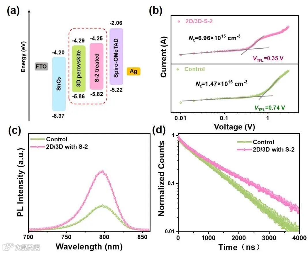 图 4. a)器件中各功能层的能级排列;b) 纯空穴器件的空间电荷限制电流(SCLC)测试;c、d) 经 S-2 处理和对照组的钙钛矿薄膜的光致发光(PL)和时间分辨光致发光(TRPL)图谱。