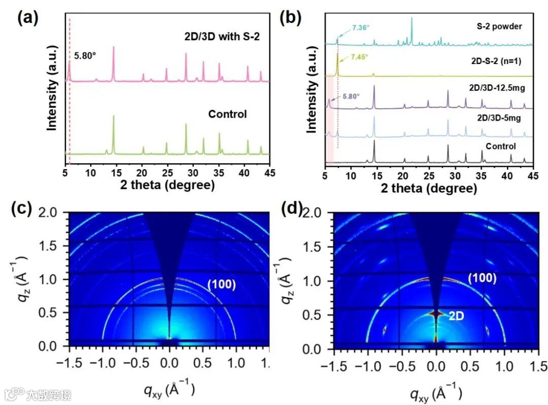 图 2. a) 对照组和经 S-2 处理的钙钛矿薄膜的 X 射线衍射(XRD)图;b) 对照组 3D 钙钛矿薄膜、粉末状态的 S-2 以及不同浓度 S-2 的 2D/3D 薄膜的 XRD 光谱;c-d) 对照组钙钛矿薄膜和 2D/3D 薄膜的 掠入射广角X射线散射(GIWAX)图谱。掠入射角为 0.4°,样品在氮气环境中。