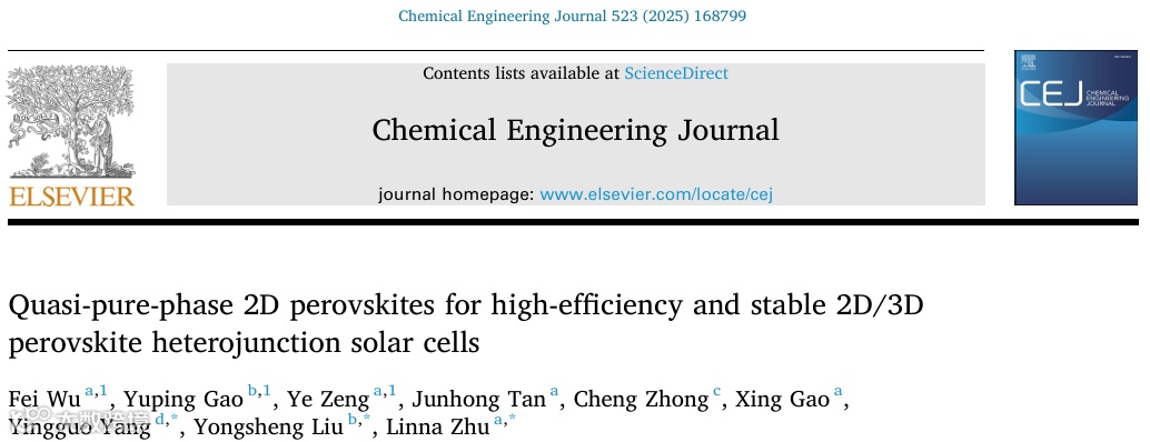 近日,来自西南大学的朱琳娜副教授与南开大学的刘永胜教授、复旦大学杨迎国教授合作,在国际知名期刊Chemical Engineering Journal上发表题为“Quasi-Pure-Phase 2D Perovskites for High-Efficiency and Stable 2D/3D Perovskite Heterojunction Solar Cells”的文章。该文提出了一种协同策略,将新型有机胺盐(2-萘基)乙基碘化铵(S-2)定向沉积在混合阳离子钙钛矿薄膜上构建2D/3D钙钛矿异质结。当 S-2 浓度适宜时,可成功制备出准纯相二维钙钛矿。最终,采用该结构的太阳能电池实现了 25.41% 的优异效率,且工作稳定性显著提升,远优于对照组器件(23.49%)。