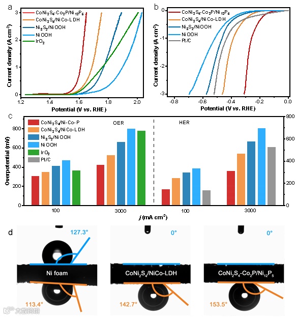 随后研究了NiOOH、Ni3S2/NiOOH、CoNi2S4/NiCo-LDH、CoNi2S4-Co2P/Ni12P5在1.0 M KOH溶液中的OER和HER性能,并分别以商用Pt/C和IrO2催化剂为对比基准(图2a和2b)。通过原位拉曼/XRD/TEM测试证实(图S11-S13),在OER过程中硫化物/磷化物转化为羟基氧化物作为催化活性位点,CoNi2S4-Co2P/Ni12P5被重构为由γ-NiOOH、γ-CoOOH和NiOOH相组成的Ni-Co羟基氧化物。此外,由于在晶体和非晶区观察到大量的缺陷,离子空位仍然存在。重构后的CoNi2S4-Co2P/Ni12P5在100 mA cm-2时OER过电位为304 mV,即使在高达3000 mA cm-2的大电流密度下,其过电位仍保持在420 mV,优于其他样品和IrO2(图2c左侧)。此外,CoNi2S4-Co2P/Ni12P5表现出更低的HER过电位,在100和3000 mA cm-2时过电位分别为149和309 mV,远低于其他催化剂和Pt/C,这显示了CoNi2S4-Co2P/Ni12P5优异的HER性能(图2c右侧)。CoNi2S4-Co2P/Ni12P5的Rs/Rct最小,进一步表明分级异质结构的电子结构发生了变化,促进了电解质中活性位点和离子之间的电荷转移(图S19)。高电流密度下的水电解催化性能与催化剂的超亲水性和超疏气性高度相关。因此,进行了水滴接触角和水下气泡试验(图2d)。CoNi2S4-Co2P/Ni12P5和CoNi2S4/NiCo-LDH均表现出超亲水性,水接触角为0°,而泡沫镍的亲水性较差(127.3°)。此外,CoNi2S4-Co2P/Ni12P5具有153.5°的大水下气泡接触角,表明其具有较低的气泡附着力和超疏气特性。超亲水性界面有利于电解质渗透,确保电解质与电极的最佳接触。超疏气界面可以增强在高电流密度HER/OER过程中产生的H2/o2气泡的释放,从而最大限度地减少气泡聚集引起的“死体积”对工作电极表面的影响。