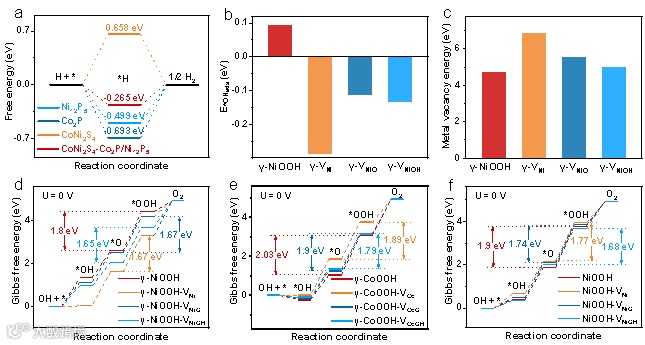 Figure 4. Thermodynamics DFT calculations. (a) Calculated free energy of *H forNi12P5, Co2P, CoNi2S4 and CoNi2S4-Co2P/Ni12P5. (b) Adsorption energy of *OH and (c) metal vacancy energy for γ-NiOOH, γ-VNi, γ-VNiO and γ-VNiOH. Gibbs free energy diagrams of OER at U = 0 V for (d) γ-NiOOH, (e) γ-CoOOH, (f) NiOOH and corresponding Ni-Co oxyhydroxides with cationic vacancies.