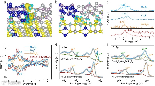 Figure 3. Electronic structures of CoNi2S4-Co2P/Ni12P5. Charge density difference between (a) Ni12P5 and Co2P and (b) Ni12P5/Co2P and CoNi2S4 (yellow regions represent electron inflow, while cyan regions indicate electron outflow). (c) The PDOS of d-band center and (d) TDOS for Ni12P5, Co2P, CoNi2S4 and CoNi2S4-Co2P/Ni12P5. High-resolution XPS spectra of (e) Ni 2p and (f) Co 2p for CoNi2S4-Co2P/Ni12P5 and Ni-Co oxyhydroxides.